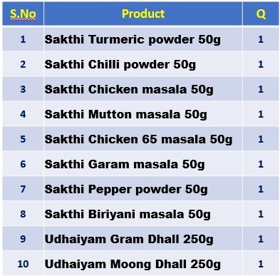 Sakthi Turmeric powder 50g, Sakthi Chilli powder 50g, Sakthi Chicken masala 50g, Sakthi Mutton masala 50g, Sakthi Chicken 65 masala 50g, Sakthi Garam masala 50g, Sakthi Pepper powder 50g, Sakthi Biriyani masala 50g, Udhaiyam Gram Dhall 250g, Udhaiyam Moong Dhall 250g